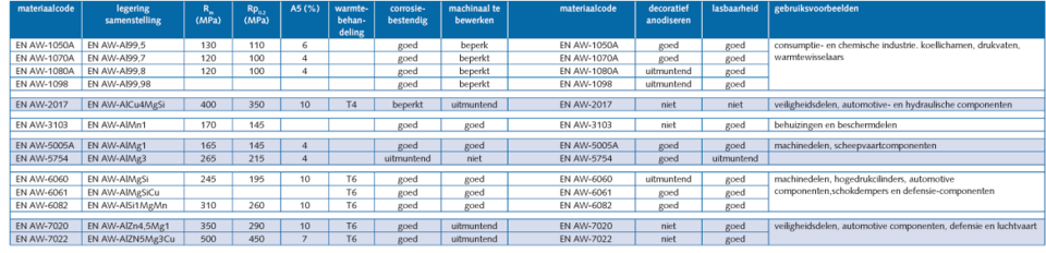 Tabel 2 Eigenschappen van door slagextrusie vervaardigde producten uit verschillende aluminiumlegeringen.