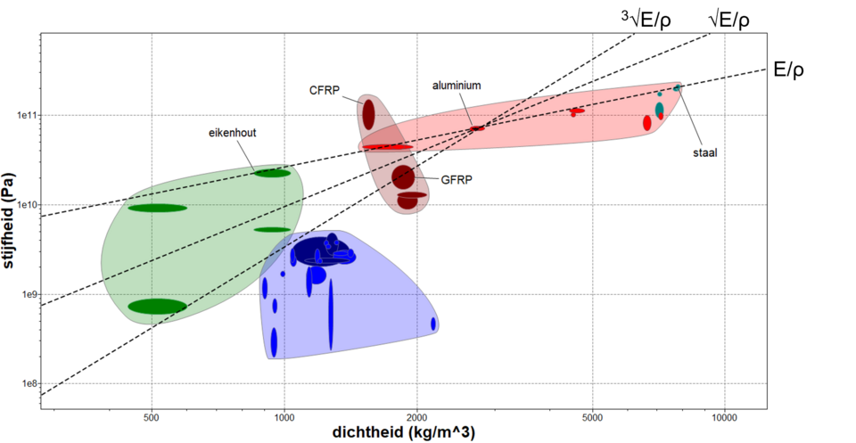 Dit compenseert keurig voor de lagere stijfheid – een opmerkelijk toeval. Anders gezegd, de materiaalindex E/ρ van beide materialen is gelijk. Als we een indexlijn met richtingscoëfficiënt 1 door aluminium trekken, zoals gedaan in Figuur 1, dan ligt staal ook op die lijn. Alle materialen erboven zijn in deze context lichter, en die eronder zijn zwaarder.
