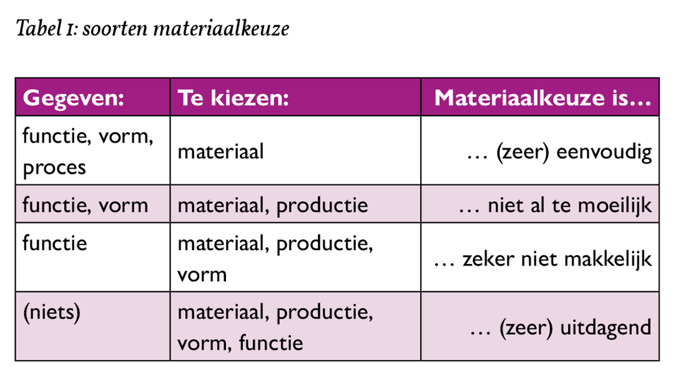 In de praktijk van het industrieel ontwerpen is het “ontdekken” van wat een nieuw product precies moet doen – dat wil zeggen, de functie(s) ervan – doorgaans deel van het ontwerpproces. Vandaar dat voor industrieel ontwerpers de materiaalkeuze vaak zo’n grote uitdaging vormt. Wat dat aangaat heeft de typische constructeur het makkelijker, want de functie die de nieuwe constructie moet gaan vervullen, is meestal reeds gegeven. Maar, zoals Tabel 1 laat zien, er zijn dan nog steeds meerdere scenario’s. En zoals de volgende sectie laat zien, kunnen we de soorten materiaalkeuze ook nog op andere manieren van elkaar onderscheiden.