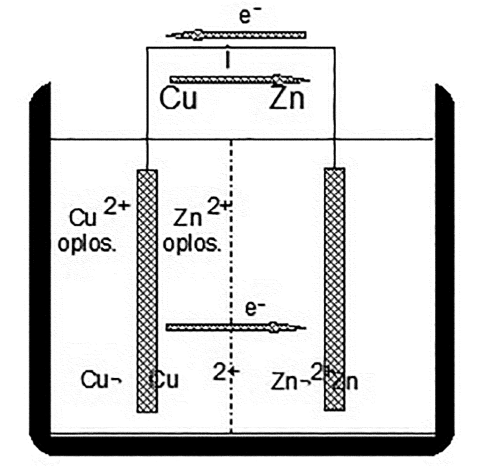Indien een koperen staaf in een koperoplossing (Cu2+) wordt geplaatst en een zinkstaaf in een zinkoplossing (Zn2+) en deze twee oplossingen van elkaar scheiden door een diafragma dat geen metaalionen doch wel elektronen doorlaat, dan zullen beide staven een potentiaal aannemen t.o.v. de oplossing en wel onafhankelijk van elkaar. Het spanningsverschil dat we kunnen meten blijkt 1,1 Volt te zijn waarbij het halfedele koper positief is t.o.v. het onedele zink. Nadat we beide staven elektrisch hebben verbonden, zal er een stroom gaan lopen van Cu naar Zn (afbeelding 1). Aan de koperen electrode vindt reductie plaats van Cu2+ ionen. Per definitie wordt de elektrode waar de reductie plaats vindt de kathode genoemd. Aan de zinkstaaf wordt zink geoxideerd tot Zn2+. Per definitie wordt de elektrode waar oxidatie plaatsvindt de anode genoemd.