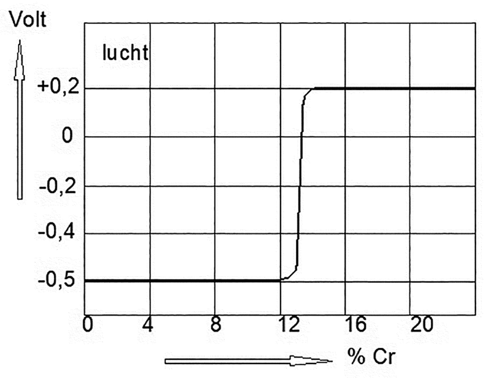 Afbeelding 4: Invloed van het chroomgehalte van een ijzerchroomlegering op de potentiaal, gemeten t.o.v. de H2-electrode in water verzadigd met lucht.