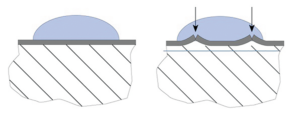 Afbeelding 5: Links een actief metaal met dichte oxidehuid; rechts laagje ijzeroxide dat door een groter volume zichzelf kapot drukt waardoor het roesten verder gaat.
