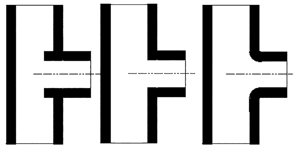 Afbeelding 9: Tee-stuk vermijd turbulentie, v.l.n.r. slecht, beter en goed.