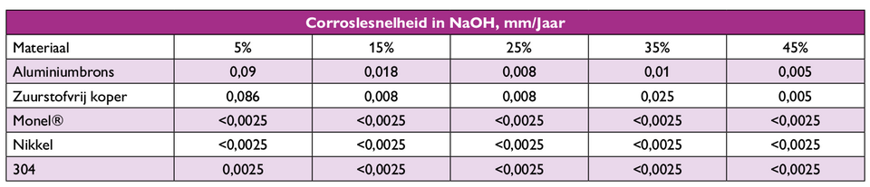 Tabel 1 Corrosie van metalen en legeringen in NaOH bij verschillende concentraties (laboratoriumproeven bij kamertemperatuur).