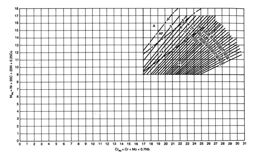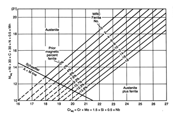 In 1949 publiceerde Anton Schaeffler het wat nu bekend is geworden as het Schaeffler diagram (afbeelding 1). Dit diagram oppert een verband tussen legeringselementen die de vorming van ferriet bevorderen (chroomequivalent, Creq, elementen) en elementen die de vorming bevorderen van austeniet en de vorming van ferriet onderdrukken (nikkelequivalent, Nieq, elementen). Om dit diagram te gebruiken worden eerst de chroom- en nikkelequivalenten berekend aan de hand van de samenstelling van een gegeven las. Vervolgens worden deze equivalenten uitgezet als coördinaten in het Schaeffler diagram. Hiermee kan een schatting worden gemaakt van de microstructuur van het lasmetaal uit de grenswaarden die in het diagram kunnen worden afgelezen. Ervaring heeft geleerd dat het Schaeffler diagram redelijk accuraat is voor conventionele lassen met beklede laselektrodes uit de 300 reeks. Het diagram is echter beperkt bruikbaar als er minder conventionele samenstellingen worden gebruikt en als er stikstof aanwezig is.