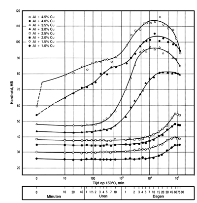 Afbeelding 3. Precipitatiehardingscurven voor binaire Al-Cu legeringen afgeschrikt in water van 100°C.