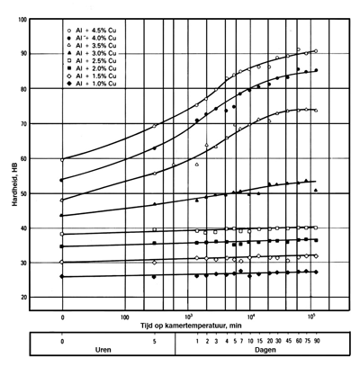 Afbeelding 2. Natuurlijke-verouderingscurven voor binaire Al-Cu legeringen afgeschrikt in water van 100°C.