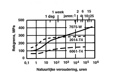 Natuurlijk verouderen is het spontaan vormen van een G-P zone structuur tijdens blootstellen aan kamertemperatuur. Opgeloste atomen klonteren afhankelijk van het legeringssysteem, of samen of precipiteren op bepaalde roostervlakken. Hierbij worden G-P zones gevormd die beter bestand zijn tegen bewegingen van dislaocaties door het rooster en dus sterker zijn. Afbeelding 1 toont de verandering in de treksterkte en rekgrens als functie van de tijd bij kamertemperatuur drie commerciële warmtebehandelbare kneedlegeringen. De toename van de sterkte verschilt sterk voor de drie legeringen evenals de snelheid waarmee deze toename plaatsvindt, hetgeen van groot praktisch belang is. Omdat 7075 en overeenkomstige legeringen nooit volledig stabiel worden onder deze condities, worden ze zelden in de natuurlijk verouderde toestand gebruikt. Legering 2024 daarentegen wordt in deze toestand juist veel gebruikt.Van de binaire legeringen vertoont aluminium-koper natuurlijke veroudering nadat het een oplosgloeibehandeling heeft ondergaan en is afgeschrikt. De mate waarin de sterkte en hardheid toeneemt wordt groter met de tijd en het kopergehalte van de legering, van ongeveer 3% tot de limiet van de oplosbaarheid in vaste toestand (5,6%). Natuurlijke-verouderingscurven voor langzaam afgeschrikte, hoogzuivere Al-Cu legeringen met 1 tot 4,5% Cu zijn te zien op afbeelding 2. Snelheid en mate van de toename van sterkte en hardheid kan worden verhoogd door de legering langer op hogere temperatuur te laten verblijven (een bruikbaar interval is 120 tot 230°C). Deze behandeling wordt precipitatieharding of kunstmatig veroudering genoemd. Bij het Al-Cu systeem beginnen legeringen, met iets meer dan 1% Cu, die wederom langzaam zijn afgeschrikt, al te harden na ongeveer 20 dagen op een temperatuur van 150°C (zie afbeelding 3). De legeringen van dit systeem, die minder dan 3% Cu bevatten, vertonen weinig tot geen natuurlijke harding na langzaam afschrikken, wat slechts weinig spanningen introduceert.