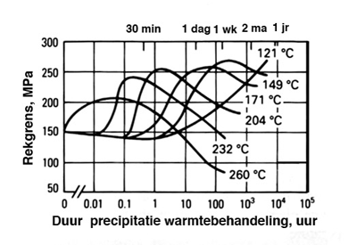 Bij deze behandeling vindt blootstelling plaats aan verhoogde temperaturen, waarbij zicht metastabiele precipitaten vormen. Deze precipitaten zijn coherent met de matrix en dragen dus bij aan de precipitatieharding. Bij verdere verhoging van de temperatuur groeien de precipitaten en gaan tenslotte over in evenwichtsprecipitaten die niet langer coherent zijn met de matrix. Deze laatstgenoemde veranderingen maken het materiaal zachter en als het nog verder wordt voortgezet ontstaat de zachtgegloeide toestand. Afbeelding 4 toont de kunstmatig-verouderingscurven van de veelgebruikte Al-Mg-Si kneedlegering 6061. In alle gevallen heeft het metaal een oplosgloeibehandeling ondergaan die werd gevolgd door afschrikken net voor de start van de precipitatie-warmtebehandeling.