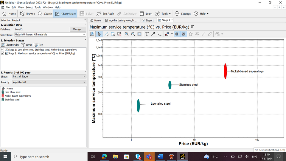 Figuur 4: kosten [€/kg] versus maximale gebruikstemperatuur, metalen (indicatief)