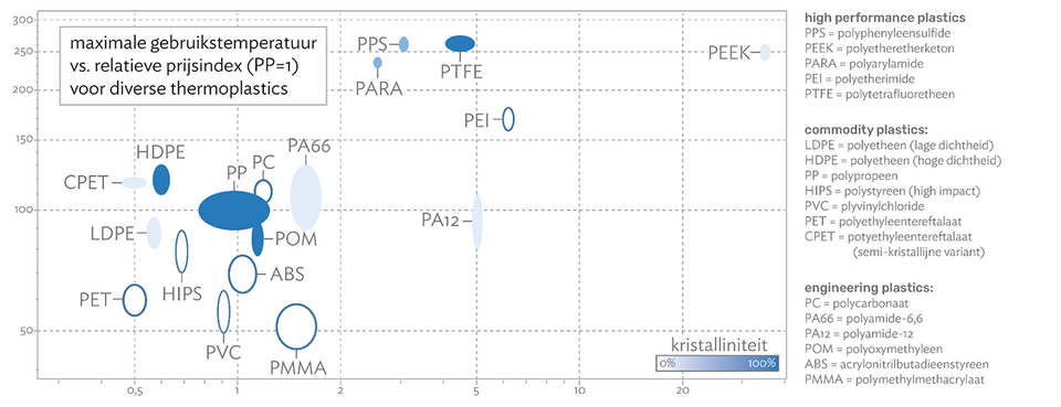 Figuur 3: relatieve materiaalprijs versus maximale gebruikstemperatuur, plastics (indicatief)