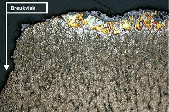 - Hardheid ter plaatse van de breuk: 550 HV (tegenover 260 HV normaal).