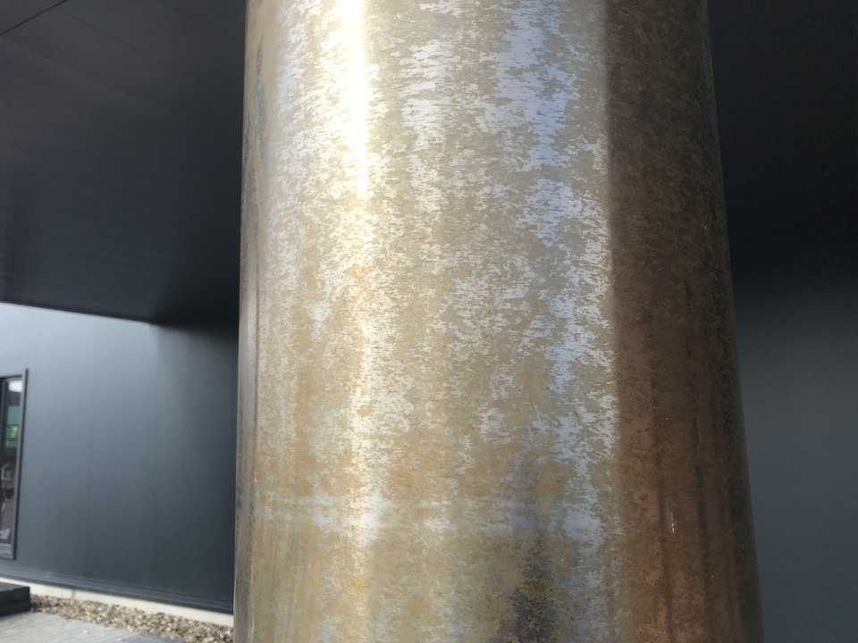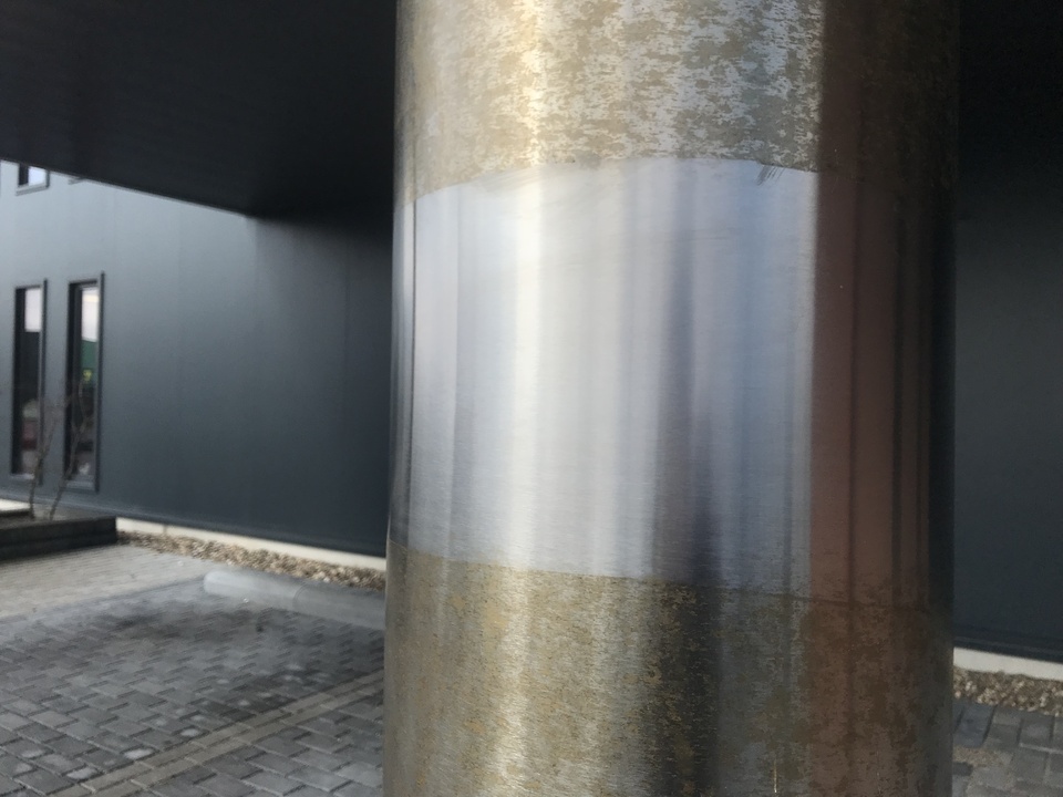 Dit betreft een kolom van roestvast staal AISI316 dat in Friesland aan een gebouw in de buitenlucht is geplaatst. Na verloop van tijd zijn deze vlekken ontstaan, hoewel er in dit geval geen enkele sprake is van maritieme omstandigheden. Dan hoor je nog wel eens zeggen ‘hoe kan roestvast staal nu roesten want het is toch roestvrij?’. Het juiste antwoord is dan ‘roestvast staal is niet onderhoudsvrij maar onderhoudsarm’. Roestvast staal bestaat bij gratie van zuurstof en indien dit beschermende gas niet bij het oppervlak kan komen, kan er inderdaad lokale corrosie ontstaan. Veelal is dit het geval onder vuilafzettingen en die zijn dan vooral aanwezig in poriën en slijpgroeven. Onder die vuilafzetting kan het kleine chloorion gemakkelijk doordringen in vergelijking met het veel grotere zuurstofmolecuul. Het chloorion is corrosief en wil graag met metalen reageren wat op zich onherroepelijk corrosie betekent. Zuurstof kan er niet voldoende bijkomen om de situatie a.h.w. te redden. Dit wordt in vakjargon ook wel ‘under deposit corrosion’ genoemd. In het Nederlands is daar geen goede omschrijving voor. Bekende voorbeelden zijn RVS 316 parkeerpaaltjes waarvan de buis geslepen is en het kapje gepolijst. Vooral in de buurt van de kust wordt de buis bruin van de theevlekken terwijl het kapje mooi blijft. Het gaat om hetzelfde materiaal maar door de ruwe slijpsporen kon er vuil achterblijven die deze corrosie op gang heeft gebracht. Op het gepolijste kapje was die kans niet aanwezig omdat immers die groeven ontbraken.