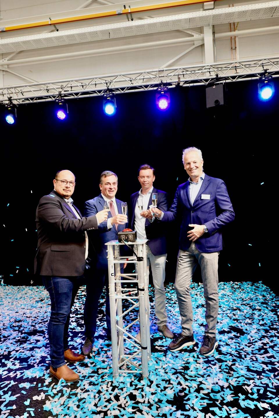 Van links naar rechts staan: Burgemeester van Hooglede Frederik Demeyere, Burgemeester van Roeselare Kris Declercq, Plant Manager 247TailorSteel België Guy van Leeuwen en CEO van 247TailorSTeel Carl Berlo.