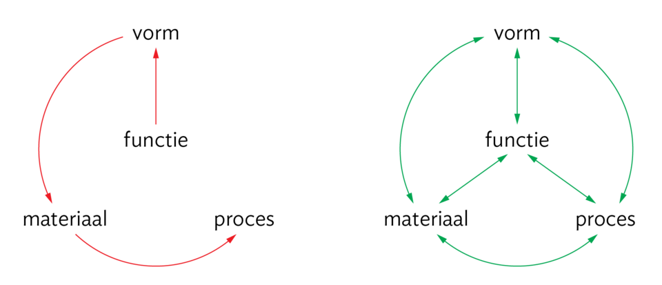 Centraal in het ontwerpproces staat de functie die onze constructie moet vervullen. Daartoe wordt een materiaal met een bepaald productieproces in een geschikte vorm gebracht – of, als het om meerdere constructiedelen gaat, de materialen, productieprocessen en vormen. Figuur 2 illustreert dit met wat bekend staat als de “functiedriehoek”. De klassieke beginnersfout is om de vier getoonde factoren sequentieel aan te pakken (links), maar dat levert slechts zelden succes op. Ervaren constructeurs zullen functie, vorm, materiaal en proces altijd in hun samenhang beoordelen en optimaliseren (rechts).