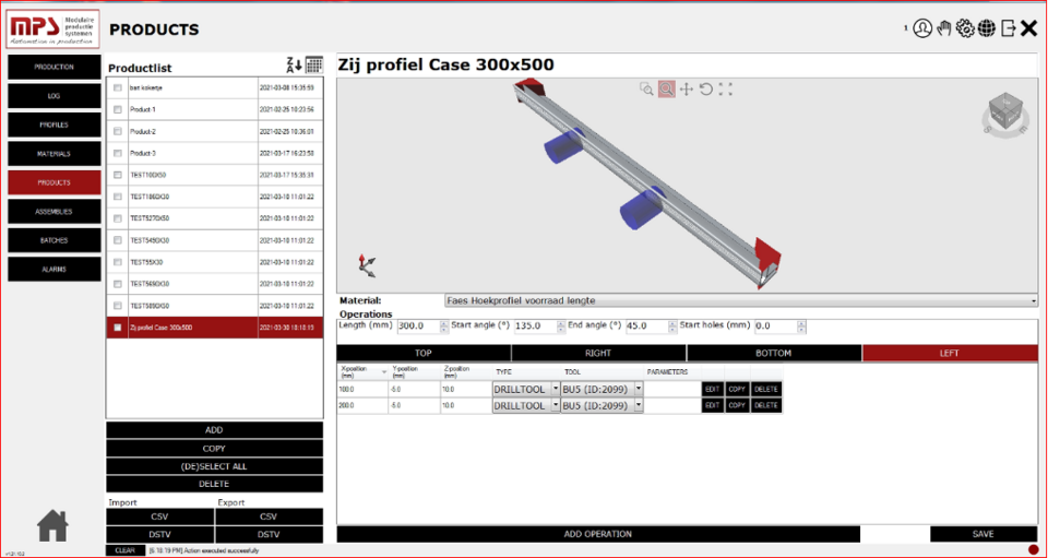 Ingelezen producten en samenstellingen worden 3D getoond. Alle bewerkingen worden vooraf ingedeeld en waar nodig wordt bij ongelijke hoeken (eindhoek voorgaand product ←→ beginhoek volgende product) een minimaal benodigd afvalstuk tussen de zagingen in berekend en afgevoerd. Uiteraard vindt bij gelijke hoeken, altijd maar 1 zaging plaats. Geheel functioneert op eerder genoemde PC (touch screen) met 21” Display, aan de machine. Tevens kan een werkvoorbereider de orders ook vooraf doorrekenen en klaarzetten voor productie. Middels een terugkoppeling van de MPS machine besturing kan de operator de voortgang van de orders real-time volgen op het scherm en de machine (bij)vullen a.d.h.v. de getoonde voortgangsresultaten. Zo wordt o.a. continue aangegeven welke producten al gemaakt zijn en hoe ver de machine gevorderd is met de huidige productie batch.