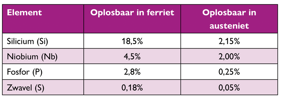 Tabel 1: oplosbare percentages verontreinigingen in ferriet en austeniet.