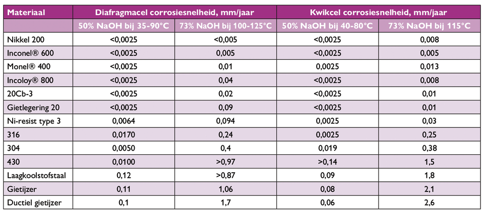 Tabel 1 Corrosie van metalen en legeringen in NaOH bij verschillende concentraties (laboratoriumproeven bij kamertemperatuur).