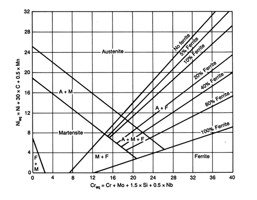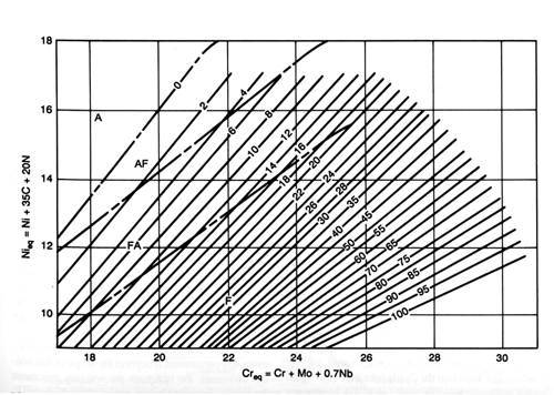 In 1949 publiceerde Anton Schaeffler het wat nu bekend is geworden as het Schaeffler diagram (afbeelding 1). Dit diagram oppert een verband tussen legeringselementen die de vorming van ferriet bevorderen (chroomequivalent, Creq, elementen) en elementen die de vorming bevorderen van austeniet en de vorming van ferriet onderdrukken (nikkelequivalent, Nieq, elementen). Om dit diagram te gebruiken worden eerst de chroom- en nikkelequivalenten berekend aan de hand van de samenstelling van een gegeven las. Vervolgens worden deze equivalenten uitgezet als coördinaten in het Schaeffler diagram. Hiermee kan een schatting worden gemaakt van de microstructuur van het lasmetaal uit de grenswaarden die in het diagram kunnen worden afgelezen. Ervaring heeft geleerd dat het Schaeffler diagram redelijk accuraat is voor conventionele lassen met beklede laselektrodes uit de 300 reeks. Het diagram is echter beperkt bruikbaar als er minder conventionele samenstellingen worden gebruikt en als er stikstof aanwezig is.