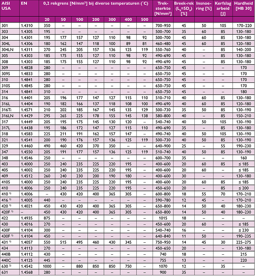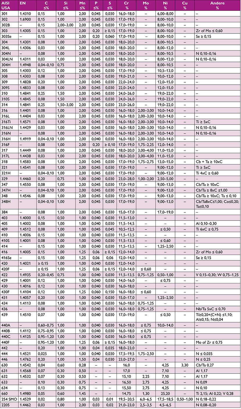 LET OP! Het is aan te bevelen dit soort vergelijkingstabellen met terughoudendheid te hanteren, aangezien kleine verschillen grote gevolgen kunnen veroorzaken (lassen, spanningscorrosie, productverontreiniging, enz.).