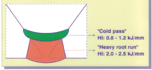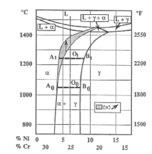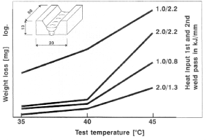 Bij het lassen moet men trachten de laatste laag aan de corrosiezijde aan te brengen. Is dit niet mogelijk, dan dient gekozen te worden voor een zware grondlaag gevolgd door relatief dunne vullagen. Bij een te dunne grondlaag gevolgd door een dikke vullaag zal de eerste laag een warmtebehandeling ondergaan over het grootste gedeelte van de grondnaad. Bij de relatief hoge temperatuur die dan in de dunne laag optreedt, zal uit het reeds aanwezige ferriet austeniet uitscheiden, welke fijn van vorm is. Dit 'gamma accent' wordt ook wel 'baby- austeniet' genoemd. Deze baby austeniet welke uit de ferriet in de vaste fase ontstaat, heeft niet dezelfde chemische samenstelling als de eerder gevormde ferriet en austeniet. Juist op de interface van deze twee structuren zal een ontmenging optreden tussen de primair gevormde structuren en de baby-austeniet, met als gevolg een zeer lokale aantasting in een hiervoor geschikt milieu. M.a.w. het is belangrijk om preferente aantasting van de grondlaag tegen te gaan door een relatief dikke grondlaag aan te brengen (ca. 2 à 2,5 kj/mm) gevolgd door een dunne tweede c.q. derde laag (H.I. ca.?1kJ/mm) (zie figuur 4 en?5). Uit figuur 6 (zie volgende pagina) van Prof. Jack Charles blijkt verder, dat het spanningsarm gloeien van duplex staal niet kan worden uitgevoerd in de bekende temperatuurgebieden.