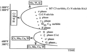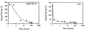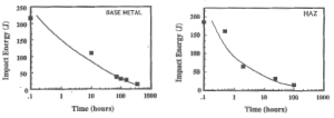 Een nadeel van duplex staal is dat bij verhoogde temperatuur de toepassingen beperkt zijn (zie ook figuur?6). De max. temperatuur is beperkt tot 280°C. Misschien zou 250°C nog beter zijn. Dit is een gevolg van de optredende 475°C-brosheid (zie figuur 7 en 8). In feite treedt deze verbrossing op tussen een temperatuur van 425 en 450°C. Dat houdt in, dat bij lasmetalen b.v. door segregatieverschijnselen helemaal niets gebeurt bij langdurig verblijf bij lagere temperaturen, het tegendeel is waar. Langdurige gloeiproeven hebben aangetoond, dat na 10.000 H expositie bij 350°C, 300°C en 280°C de kerftaaiheid duidelijk afneemt en bij 250°C slechts een geringe achteruitgang van de kerftaaiheid is vast te stellen. Internationaal wordt voor duplex staal een max. bedrijfstemperatuur van 250°C geaccepteerd (zie figuur 9).
