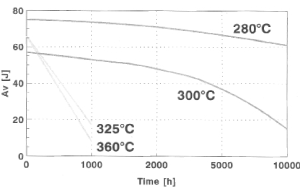 Uit figuur 6 blijkt, dat men bij een kort verblijf op een verhoogde temperatuur nog niet wordt geconfronteerd met verbrossingsverschijnselen. Eén en ander houdt in, dat vervormingen van plaatvelden ten gevolge van lassen, door plaatselijke verhittingen gevolgd door snelle koeling (waardoor plaatselijke krimp ontstaat) tot de mogelijkheden behoren.