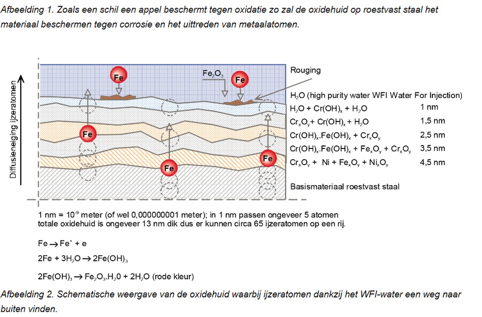 Met deze schil gebeurt dit niet en dat is op zich best opmerkelijk dat zo’n schilletje van slechts ongeveer 0,1 mm in staat is de appel te behoeden voor oxidatie. De schil vormt dus een goed afsluitend laagje dat inherent verbonden is aan het vruchtvlees c.q. substraat. Met roestvast staal is dit in feite ook het geval hoewel deze huid duizenden maal dunner is. Over het algemeen spreekt men bij roestvast staal over een chroomoxidehuid maar in de praktijk blijkt dit wat te simpel gesteld te zijn. Op afbeelding 2 ziet men dat deze oxidehuid wel uit vijf verschillende laagjes bestaat. De twee toplagen bevatten geen ijzerverbindingen en vormen de ultieme afsluiting zodat er geen metaalatomen uit kunnen treden. Indien deze huid mechanisch wordt beschadigd zal zuurstof ter plaatse zorgen voor een nieuwe oxidehuid waardoor roestvast staal zichzelf a.h.w. repareert. Toch blijkt dat deze absolute dichtheid bepaalde grenzen kent want bij zeer zuiver water komt er een merkwaardig diffusieproces op gang. Onder het zuivere water wordt veelal WFI-water en ‘polished water’ bedoeld.