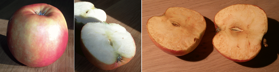 Afbeelding 1. Zoals een schil een appel beschermt tegen oxidatie zo zal de oxidehuid op roestvast staal het materiaal beschermen tegen corrosie en het uittreden van metaalatomen.