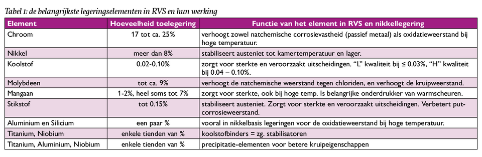 Met het toenemen van de corrosiviteit van een medium moet het percentage corrosiewerende legeringselementen omhoog om roestvastheid te bewaren. Dit is het gebied van de volledig austenieten en nikkelbasis-legeringen. Voor hogetemperatuurtoepassingen worden austenieten of nikkellegeringen geselecteerd vanwege hun goede mechanische eigenschappen bij hoge temperatuur. Om die nog verder te verbeteren worden legeringselementen toegevoegd die precipitaten geven. Dit beïnvloedt soms de metallurgische lasbaarheid. Wanneer bij hoge temperatuur ook een oxidatief milieu heerst, worden nog extra legeringselementen toegevoegd die een nog beter afsluitende oxidehuid vormen dan chroom. De belangrijkste legeringselementen die worden toegevoegd aan RVS en nikkellegeringen zijn gegeven in tabel 1.