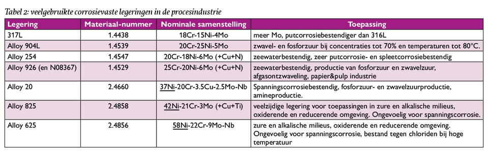 In de loop der jaren zijn honderden corrosievaste legeringen ontwikkeld. Sommige zijn niet meer in gebruik omdat er betere varianten op de markt zijn gekomen. Andere zijn heel specifiek voor enkele bepaalde toepassingen, zoals de nikkel-molybdeenlegeringen (Hastelloy B) voor geconcentreerd zoutzuur. In de onderstaande tabel 2 staan de allround legeringen die veel worden toegepast in de (petro-)chemie die geschikt zijn voor steeds hogere chlorideconcentraties en sterkere zuren. In de onderstaande tabel zijn de duplex roestvaste stalen, die inmiddels een vaste plaats hebben verworven in de (petro-)chemie, weggelaten, omdat deze buiten het kader van dit artikel vallen.