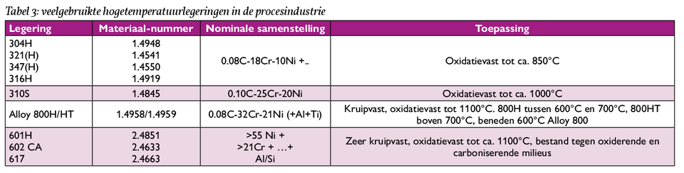 Voor de hogetemperatuur-legeringen in de procesindustrie kennen we de “H”-kwaliteiten van de 300 serie RVS met 0.04-0.10% koolstof. Daarnaast is er een groot aantal nikkelbasislegeringen dat wordt toegepast bij hoge temperatuur, alle met een relatief hoog koolstofpercentage om de kruipweerstand te verbeteren door carbideuitscheiding. Vaak zitten er nog andere precipiterende elementen in zoals titanium en aluminium, die met nikkel Ni3(Al,Ti) (γ’, “gamma prime”) precipitaten vormen. Omdat bij hoge temperatuur de oxidatiesnelheid in lucht toeneemt, wordt steeds meer chroom toegepast bij toenemende temperatuur. Ook andere oxidevormende elementen als aluminium en silicium komen voor. In tabel 3 staan een paar voorbeelden genoemd van hogetemperatuurlegeringen.