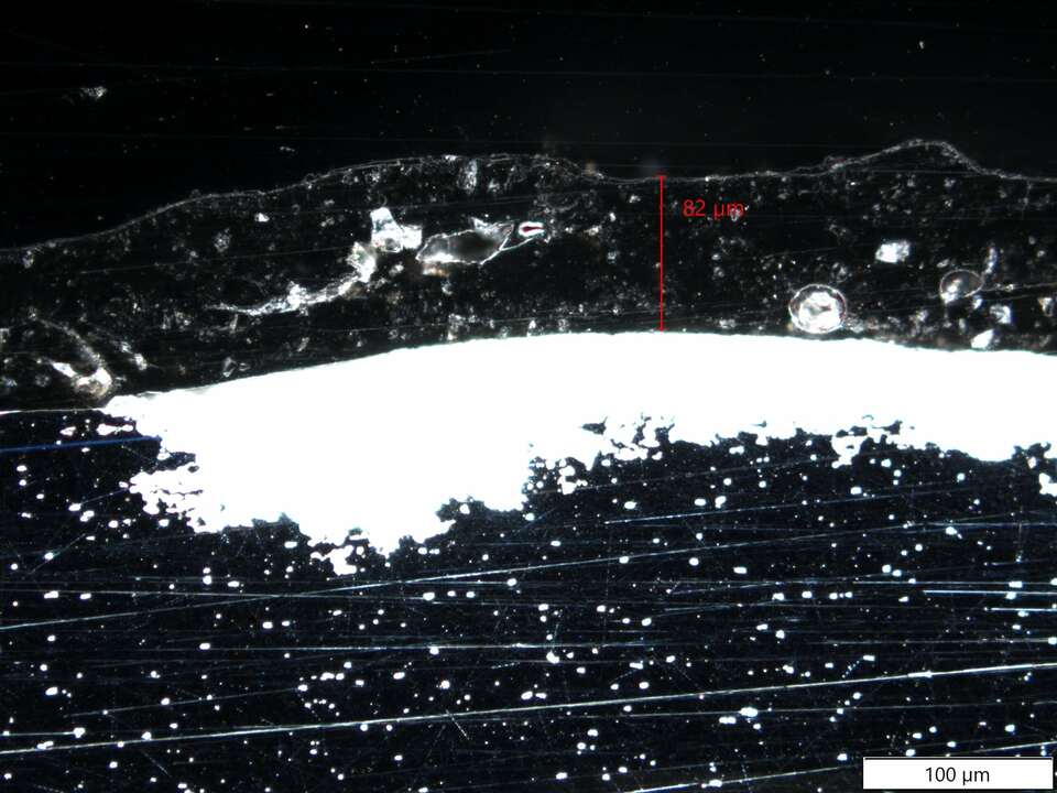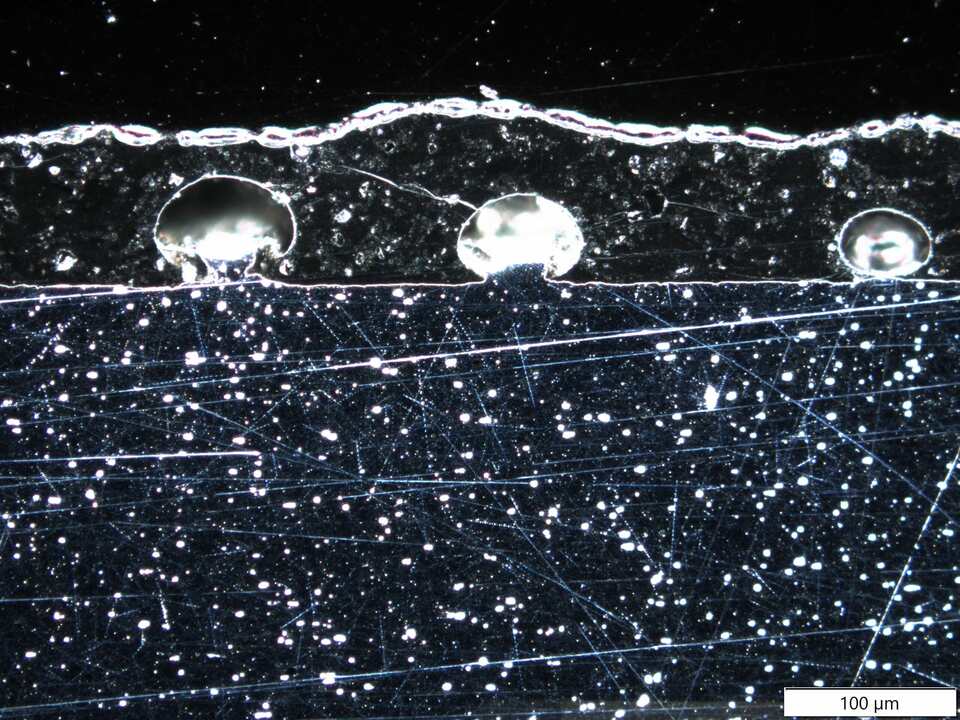 (Lichtmicroscopisch beeld (darkfield) van een sectiezone met scheurvorming in de coating (groot wit gebied = corrosieproduct van het aluminium)