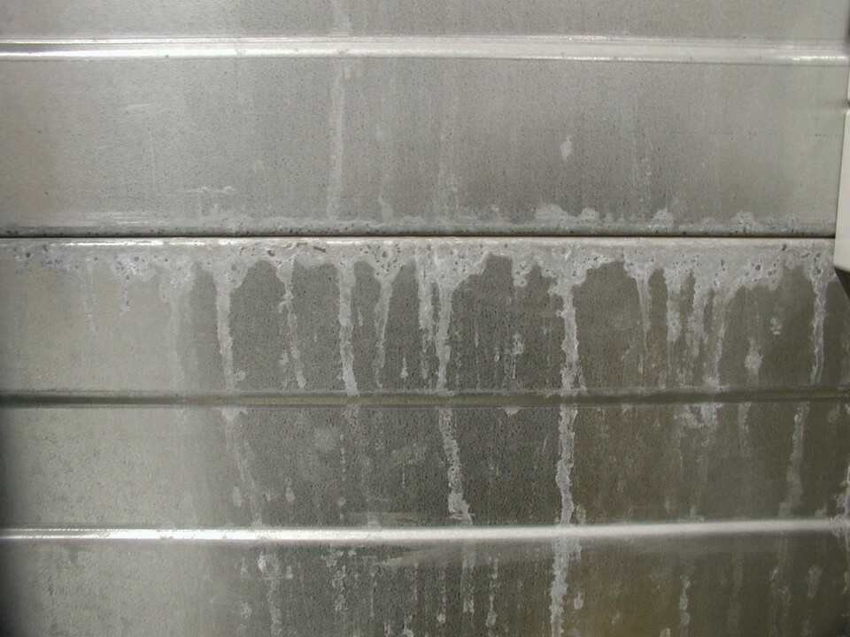 De aantasting betreft een corrosievorm gelijkaardig aan witcorrosie, maar waarbij de corrosie te wijten is aan de langdurige aanwezigheid van vloeistofdruppels op de richel en dito uitloop langsheen het verticaal wandgedeelte. Voor zowel de bovenste plooiranden als de bovenvlakken beperkte de aantasting zich volledig tot de zinklaag. De zinklaag was op verschillende plaatsen weliswaar opgebruikt tot op het staaloppervlak, maar er werd nog geen noemenswaardige aantasting van het staal waargenomen; dit laatste werd bevestigd door de spectraalanalyses van de corrosieproducten, waarin geen sporen van ijzer werden teruggevonden. Buiten zink en zuurstof vertoonden de spectraalanalyses van de corrosieproducten veelal ook sporen van silicium, chloor, zwavel, kalium en/of calcium. De detectie van zwavel kan hier wijzen op de aanwezigheid van sulfaten die, samen met chlorides, corrosie-bevorderend werken. Zij konden echter niet als hoofdoorzaak voor de corrosie worden aangewezen omdat zij niet in alle onderzochte aantastingszones werden teruggevonden. Hetzelfde geldt voor silicium, kalium en calcium, die op zich afkomstig kunnen zijn van onzuiverheden in bijvoorbeeld water en/of van de werkzaamheden in de hal. Alle voorgaande vaststellingen wijzen er op dat de industriehal gedurende lange tijd werd blootgesteld aan een hoge vochtigheidsgraad, waarbij condensatie leidde tot afvloeiing van vocht langsheen de binnenwand en dito opstapeling van druppels op de bovenste plooiranden en opstapeling van vocht in de tussenruimtes tussen de cassettes.