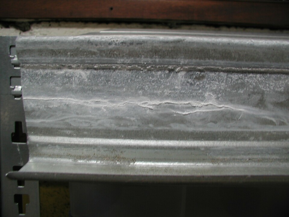 - De tweede zone is het bovenvlak, i.e. het vlak dat zich in gemonteerde toestand bovenaan een cassette bevindt en waarop de bovengelegen cassette is ingeklikt. Deze zone vertoont een wit gekleurd corrosiepatroon – zie foto bovenvlak. Ook deze aantasting doet zich voor over een aanzienlijk gedeelte van de cassettes in de hal.