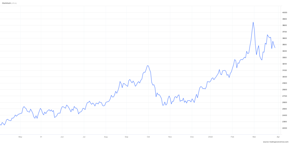 Aluminium reageert heel anders op de oorlog dan staal. Zoals u in afbeelding 2 kunt zien is de basisprijs van aluminium is niet zo astronomisch gestegen. Dat heeft veel te maken met toenemende Chinese productie en het gebrek aan sancties op de Russische aluminium smelter Rusal dat goed is voor 5% van de wereldproductie. Oekraïne produceerde voor de oorlog al geen significante hoeveelheden aluminium. Binnen de aluminiumsector hoopt men dat sancties op Rusal uit zullen blijven vanwege het strategische belang van Russisch aluminium voor de Europese industrie. Maar zelfs zonder directe sancties op Rusal merkt de Europese aluminiumsector wel degelijk iets van de oorlog. Ten eerste omdat Rusal productie- en uitvoerproblemen heeft als gevolg van sancties op andere goederen. Rusal komt op dit moment niet aan voldoende aluminiumoxide. Een groot deel daarvan kwam namelijk uit Oekraïne en Australië. Beide stromen van het materiaal liggen nu stil. De een als gevolg van de oorlog, de anders als gevolg van Australische sancties. Daarnaast blijkt het erg moeilijk te zijn voor het aluminium dat Rusal nog produceert om een weg te vinden naar Europese klanten. Wederom zorgen sancties op andere sectoren ervoor dat het aluminium moeilijk op de plaats van bestemming kan komen. Dit zorgt dus toch voor de nodige leveringsproblemen in Europa waardoor we weliswaar nog geen enorme stijging van de basisprijs zien, maar de spot premiums rijzen wel de pan uit. Dit premium betalen eindgebruikers bovenop de basisprijs van aluminium om het ook daadwerkelijk te ontvangen.
