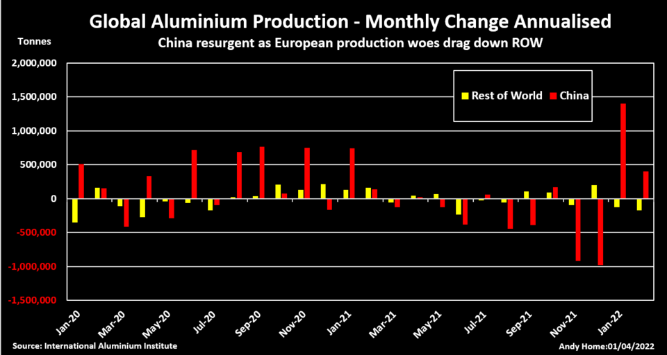 Nog iets dat deze premiums opdrijft is de torenhoge elektriciteitsprijs. Het smelten van aluminium vereist veel elektriciteit. Elektriciteitsprijzen zijn daarom nauw verweven met aluminiumprijzen. Nu die eerste stijgen als gevolg van de oorlog wordt het ook duurder om aluminium te produceren; met name in Europa waar de prijzen verreweg het hardst stijgen. Eind vorig jaar zagen we al behoorlijke stijgingen in energieprijzen. Als gevolg daarvan verminderen Europese smelters hun productie, wat leidde tot lokale schaarste van het metaal en dus tot hogere premiums. Voor iedere ton aluminium betaalde je afgelopen herfst zo’n 350 euro premium. De oorlog doet hier nu een schep bovenop. Het premium is inmiddels opgelopen tot 550 euro per ton door nóg hogere energieprijzen en verder dalende productie in Europa. In januari en februari met daalde die met 10%. Daarmee is de productie in een jaar tijd al gekrompen van zo’n 4,5 miljoen ton naar minder dan 3 miljoen ton. Het laagste productieniveau ooit. Gelukkig kunnen we wel een kanttekening plaatsen bij al deze kommer en kwel. Het lijkt erop dat China in staat is om in ieder geval een deel van de schaarste weg te nemen. China was de afgelopen jaren een netto-importeur van aluminium (zie afbeelding 3), maar lijkt nu in het gat te springen dat Europese smelters achterlaten. Chinese productie stijgt sinds een paar maanden. Dat was eigenlijk in reactie op de aantrekkende economie en onder normale omstandigheden zou het aluminium naar Chinese klanten gaan. China kampt echter met een nieuwe reeks lockdowns als gevolg van een nóg besmettelijkere sub-variant van het Omikron COVID virus. De Chinese markt kan al dat aluminium dus niet absorberen en zo gaat het richting Europa. We verwachten daarom dat premiums de komende maanden niet ver door zullen stijgen. Of ze vervolgens ook zullen dalen valt te betwijfelen, want het is lang niet zeker of China naar Europa zal blijven exporteren. Chinese lockdowns zullen op den duur weer eindigen en Europese smelters zullen in Brussel klagen over hun concurrentiepositie.
