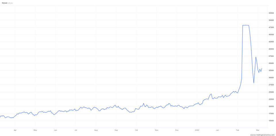 Terwijl prijzen stegen als gevolg van zorgen over de oorlog kwamen sommige bedrijven met shortposities in de problemen. Een bedrijf dat short gaat gokt erop dat de waarde van een goed in de nabije toekomst zal dalen en hoopt daarvan te profiteren. De exacte manier waarop bedrijven short (of long) gaan met metalen op de LME is vrij ingewikkeld en dit is niet de plek voor een uitgebreide verhandeling over beleggen. Het volstaat om te weten dat short en long gaan een heel normaal middel is waarmee bedrijven zich indekken tegen koersschommelingen. De ene keer profiteren ze van hun long posities de andere keer van hun shorts. Dit keer kwamen verschillende bedrijven in de problemen toen de prijs van nikkel zo snel steeg dat hun shorts zoveel veel verlies opleverden dat ze dit niet meer konden dekken. Eén bedrijf ging bijzonder hard onderuit: Tsingshan. De LME zegt officieel dat het de handel heeft stilgelegd om orde te bewaren en om de handel te stabiliseren. In werkelijkheid lijkt het erop dat het China het Chinese moederbedrijf van de LME heeft opgedragen om ander groot Chinees bedrijf te redden van een faillissement. Of dat echt waar is zullen we waarschijnlijk nooit te weten komen, maar het heeft er alles van weg. Voor de nabije toekomst lijkt het erop dat nikkel een volatiele periode tegemoet gaat. De onderliggende factoren die de prijsstijging van begin maart aanjoegen zijn immers niet veranderd. De vraag naar nikkel is groter dan de productie, voorraden zijn bijna op en maar liefst 17% van de wereldwijde productie kan Rusland mogelijk niet uit.