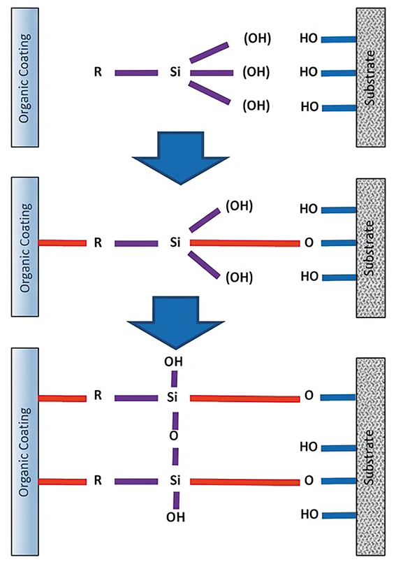Er bestaan meerdere typen hechtingsbevorderaars met eigen eigenschappen. Voor staaloppervlakken worden organofunctionele silanen toegepast. Deze hebben de algemene formule R – Si – X3, waarbij Si de kern van het molecuul is, R een functionele groep en X een tweede functionele groep. R hecht aan de organische hars en vormt een covalente binding met de deklaag, terwijl X via hydrolyse (met vocht op het staaloppervlak, doorgaans voldoende aanwezig) aan het staal hecht. De schematische binding is weergegeven in de onderstaande afbeelding.